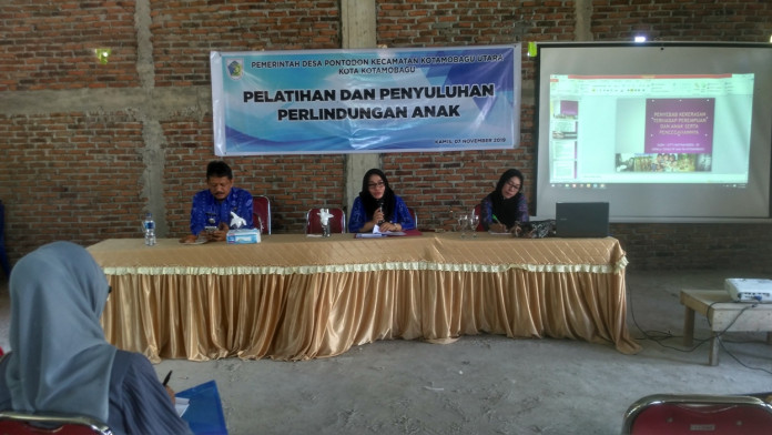 INFOKINI.NEWS, KOTAMOBAGU – Ketua Tim Penggerak PKK Kotamobagu, Angki Taurina Mokoginta, bersama Kepala Kepala Dinas Pemberdayaan Perempuan dan Perlindungan Anak (P3A) Kotamobagu Siti Rafika Bora menjadi pembicara pada sosialisasi pelatihan dan penyuluhan perlindungan anak yang di gelar oleh Pemerintah Desa Pontodon, Kamis (7/11/2019) kemarin.