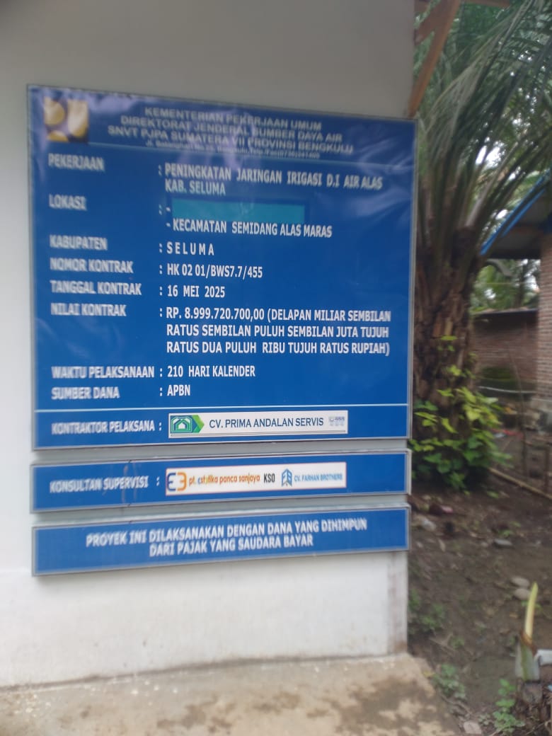 IKNews, BENGKULU SELATAN — Proyek Peningkatan Jaringan Irigasi Kiri D.I. Air Alas Tahun 2025 di Kabupaten Seluma, Provinsi Bengkulu, yang menelan anggaran Rp8.999.720.700 dari dana APBN, kini menuai sorotan tajam. Proyek ini berlokasi di Kecamatan Semidang Alas dan Semidang Alas Maras, dan dilaksanakan oleh pihak kontraktor CV. Prima Andalan Servis.