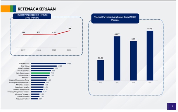 Tahun 2020, dari total penduduk Kota Kotamobagu yang berada dalam kelompok usia kerja 15 tahun keatas, sebanyak 66,48 persennya merupakan angkatan kerja. Dari jumlah Angkatan kerja tersebut 92,56 persen berstatus bekerja, sedangkan sekitar 7,44 persennya menganggur ini menunjukkan kenaikan pengangguran dari tahun sebelumnya yakni 5,62 Persen pada tahun 2019
