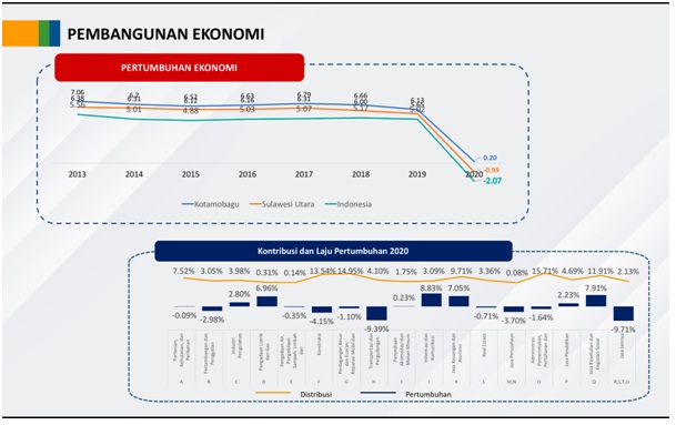 Perekonomian Kota Kotamobagu Tahun 2020 melambat sebesar 0,20 persen. Pertumbuhan melambat oleh hamper semua lapangan usaha yang paling tinggi perlambatannya adalah Transportasi dan Pergudangan sebesar -9,39% dan Jasa Lainnya yakni -9,71%. Pertubuhan yang mengalami kenaikan yaitu di sector Jasa Komunikasi dan Informasi mencapai 8,83% dan Jasa Keuangan dan Asuransi mencapai 7,05%