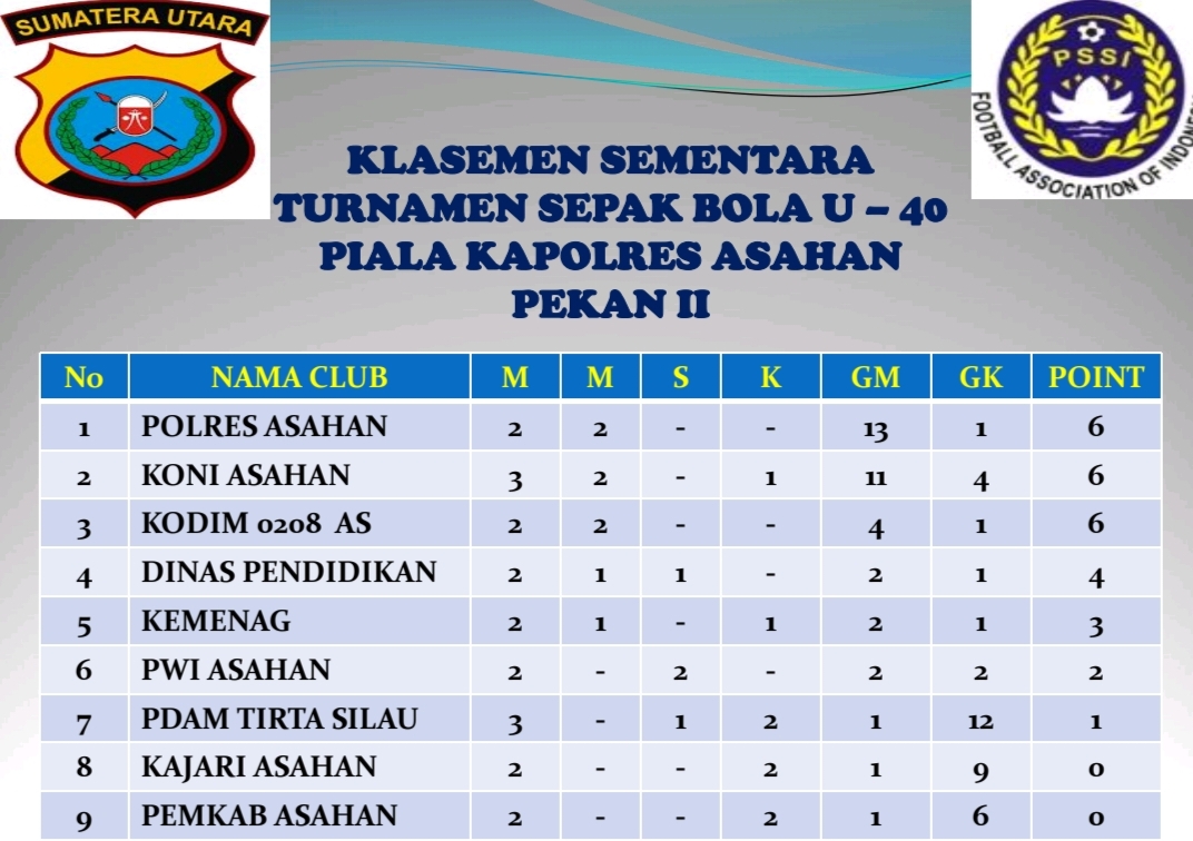 Inilah Klasemen Sementara Turnamen Sepak Bola U – 40 Piala Kapolres Asahan Pekan II :