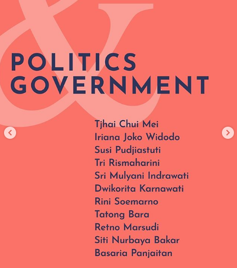 Di deretan nama yang dirilis pada kategori tersebut, juga terdapat nama isteri Presiden RI Joko Widodo, Iriana Joko Widodo, hingga sejumlah Menteri Kabinet Kerja Jokowi-JK, dan Wali Kota Surabaya Tri Rismaharini.