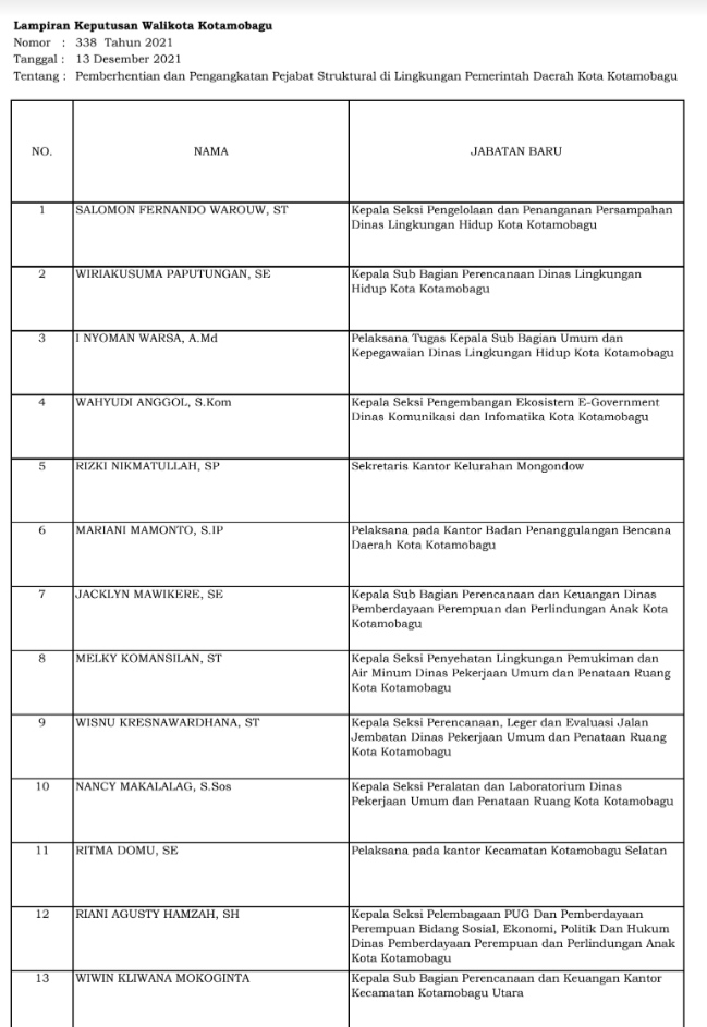 Hal ini berdasarkan Surat Keputusan (SK) Wali Kota Kotamobagu Nomor 338 Tahun 2021 tentang Pemberhentian dan Pengangkatan Pejabat Struktural di Lingkungan Pemerintah Daerah Kota Kotamobagu, tertanggal 13 Desember 2021.